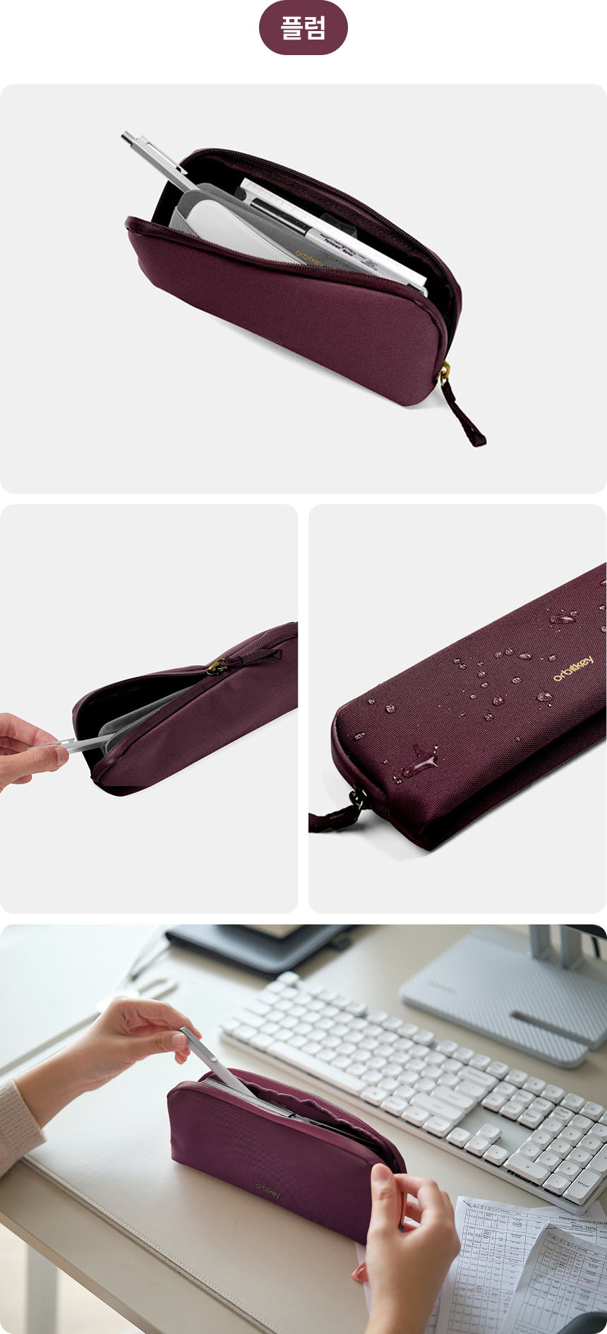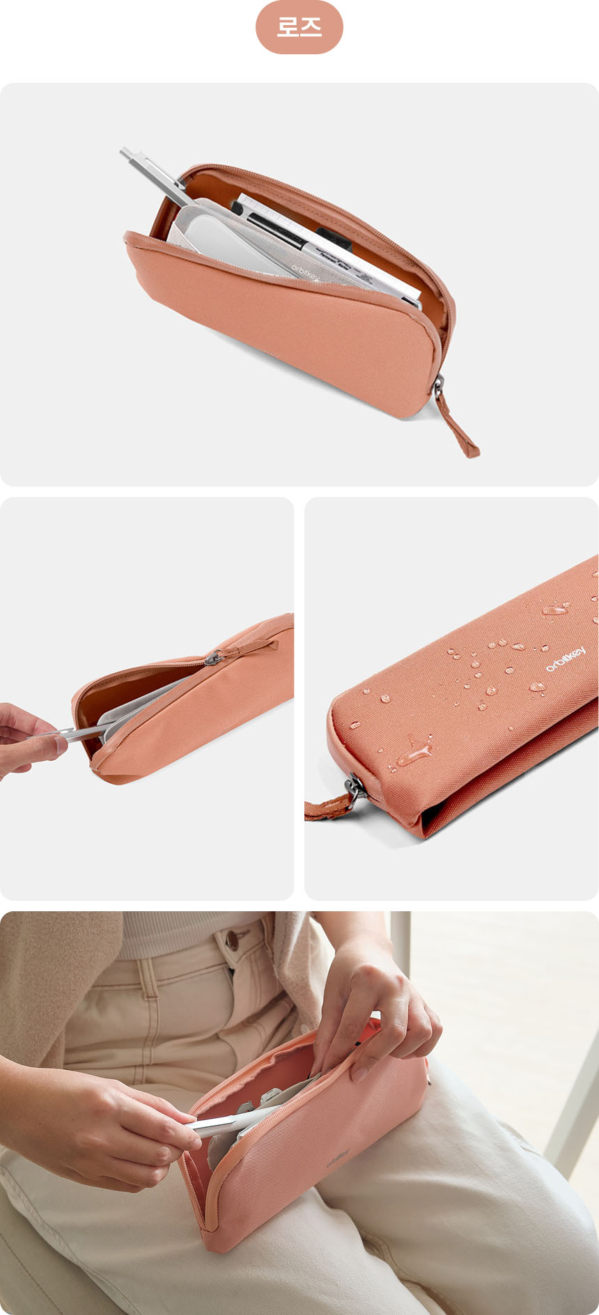 오비키는 지속가능성을 고민하고 디자인에 반영해요. 오래 사용할 수 있도록 내구성이 좋은 재활용 폴리에스터로 파우치를 만들었어요.